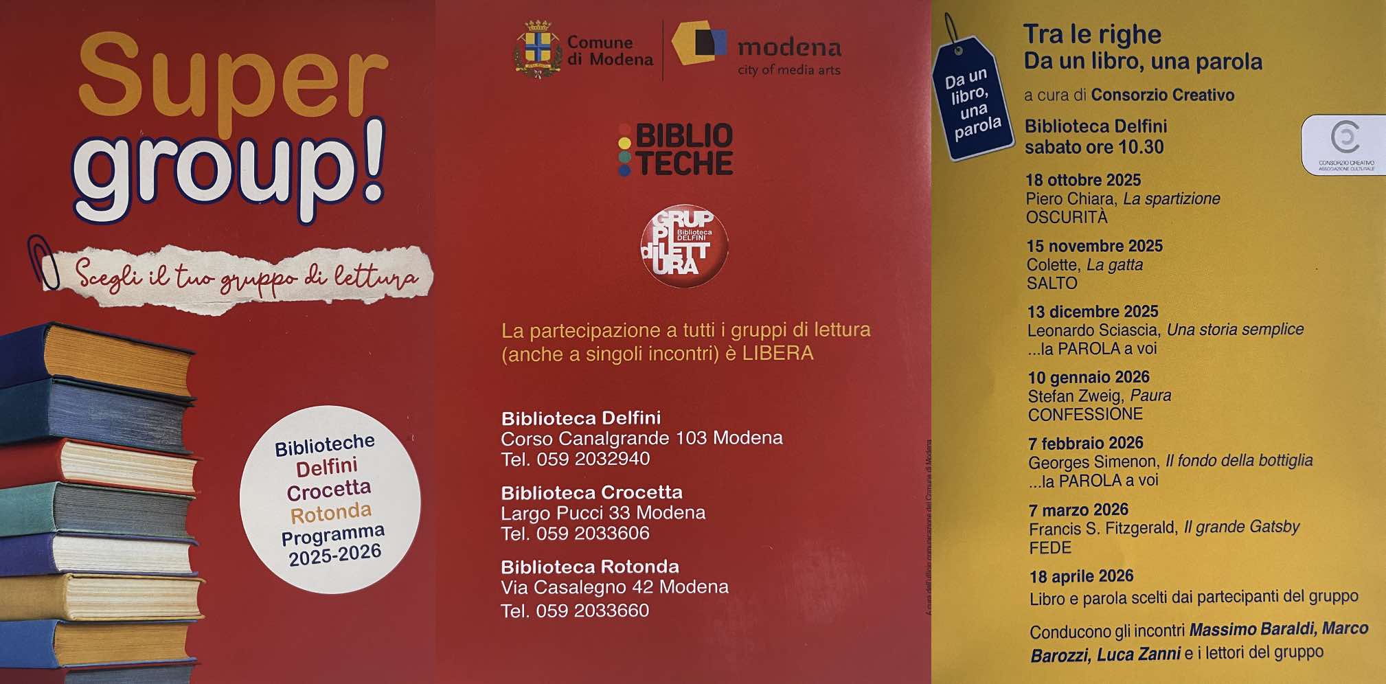 Dal 18 ottobre 2025 al 18 aprile 2026Tra le righe: da un libro una parola 2025-2026"Da ogni libro una parola. Emblema del racconto e promessa di nuove narrazioni". Massimo Baraldi, Luca Zanni e Marco Barozzi animano un nuovo ciclo di incontri: sette opere letterarie e altrettante parole chiave.
